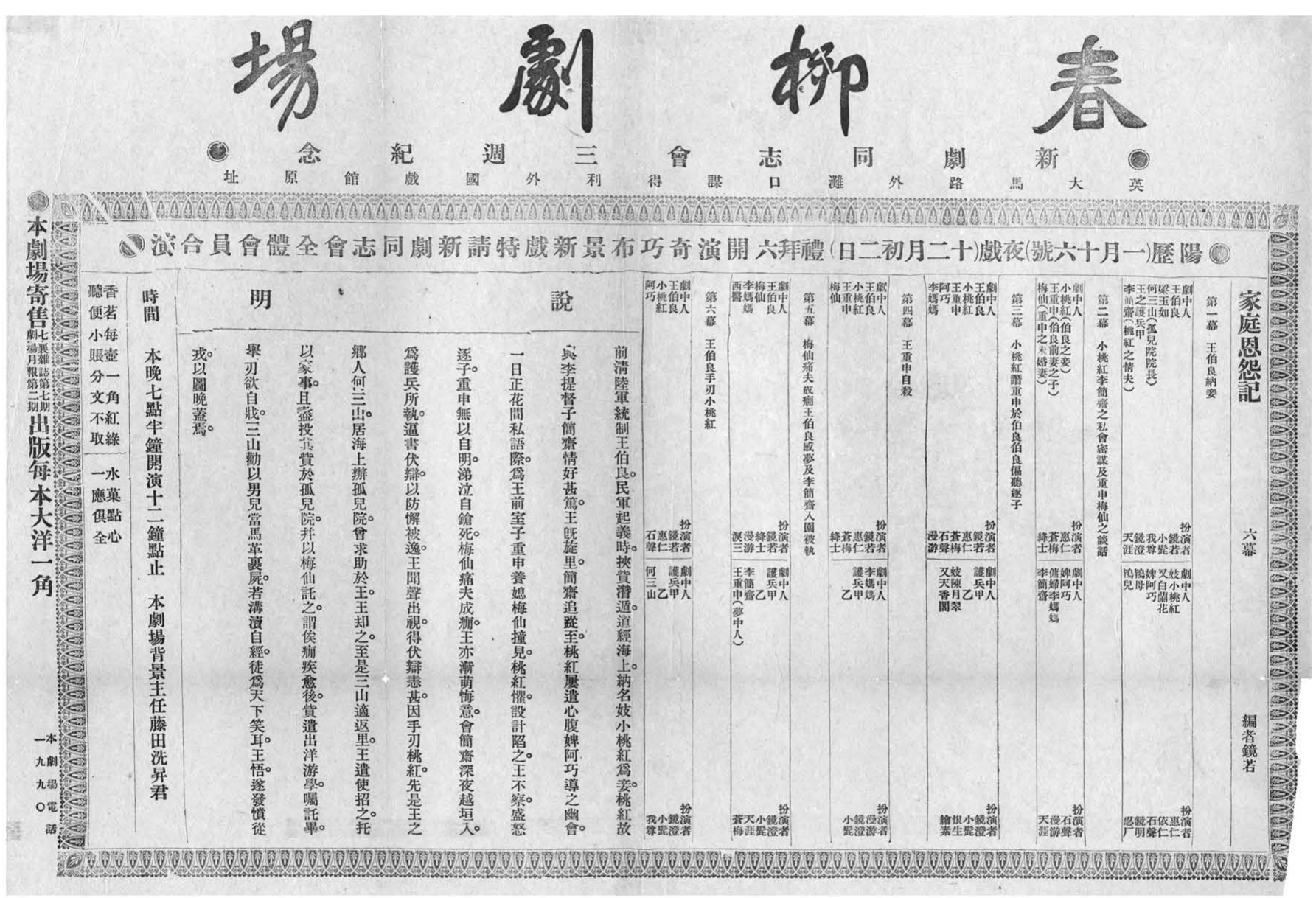 1914年1月春柳劇場謀得利劇場《家庭恩怨記》説明書原版阅读